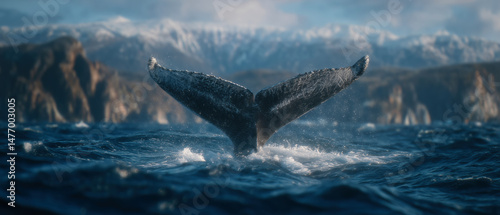 © OHMAl2T, Fototapeta premium Majestic Whale Tail Breaking Surface in Serene Seascape with Mountains