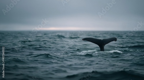 © Echt&KIreativ, Naklejka premium Majestic whale tail disappearing into deep blue ocean during sunset