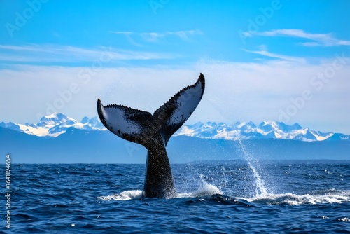 Fototapeta premium Majestic whale tail emerges from blue ocean waters with icy mountains in...