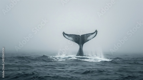 Fototapeta premium Majestic whale tail emerging from misty waters
