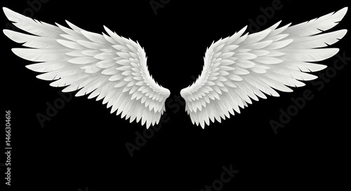 © Natthapong, Obraz premium Majestic White Angel Wings on Black Background for Artistic Use