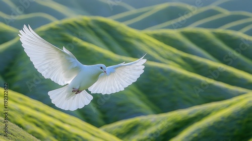 © amorn_m, Obraz premium Majestic White Bird in Flight Over Lush Green Landscape