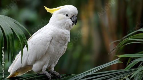 © Thinnawat, Fototapeta premium Majestic White Cockatoo Perched Among Lush Green Leaves
