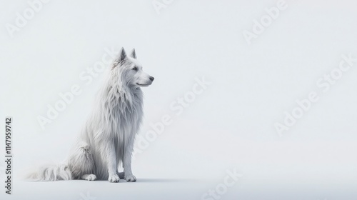 © Praphat, Obraz premium Majestic White Dog Sitting Gracefully on Soft White Background