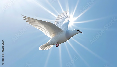 Fototapeta premium Majestic White Dove Soaring in a Heavenly Sky