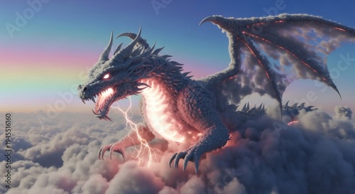 Fototapeta premium Majestic white dragon with glowing eyes and lightning soaring above fluffy clouds under a vibrant rainbow sky