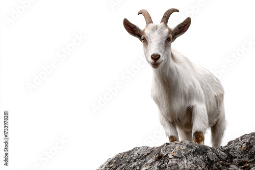 © Roman_Studio, Fototapeta premium Majestic white goat standing proudly on rocky outcrop, isolated on white background.