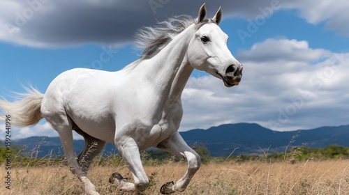 © HambaTuhanImages, Obraz premium Majestic white horse galloping across a field under a partly cloudy sky