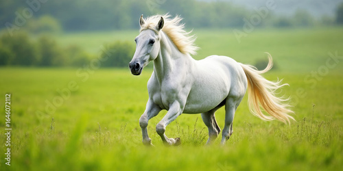 © grethental, Obraz premium Majestic White Horse Galloping in a Lush Green Field