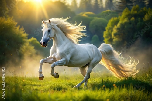 Fototapeta premium Majestic White Horse Galloping in Verdant Meadow - Stunning Equestrian Stock...