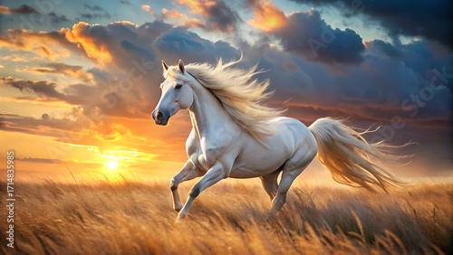 © HabibaAkter, Obraz premium Majestic White Horse Galloping Through Golden Field at Sunset with Dramatic Sky