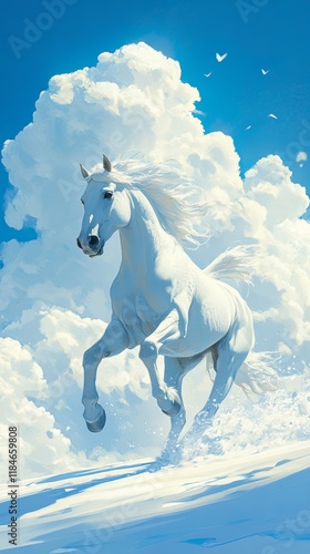 © Denys, Fototapeta premium Majestic White Horse Galloping Through Snowy Landscape