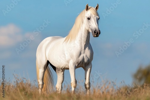 © Outkast, Fototapeta premium Majestic white horse grazes in a golden field under a blue sky, nature background
