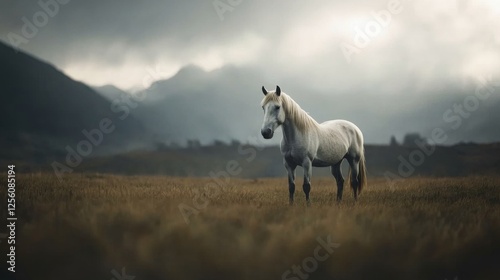 © musa, Obraz premium Majestic white horse in mountain pasture, sunrise
