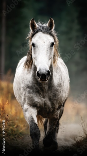 Obraz premium Majestic white horse running along a woodland path with golden grass in the...