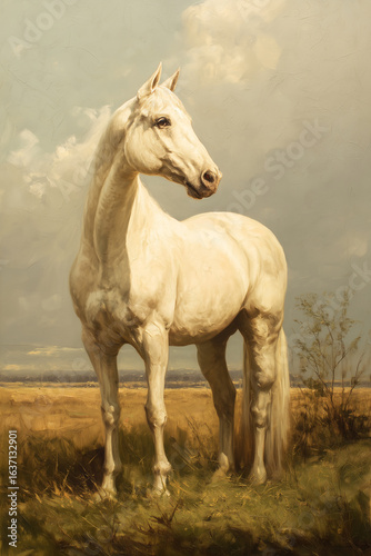 © Usaginikov, Obraz premium Majestic White Horse Running in Sunset Landscape