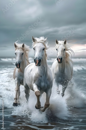Obraz premium Majestic White Horses Galloping Through Ocean Waves Powerfully Dramatic...