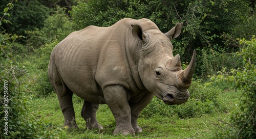 © Firman Dasmir, Fototapeta premium Majestic white rhinoceros in its natural habitat amidst lush greenery