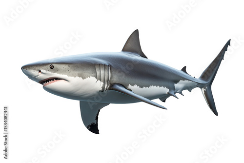 Fototapeta premium Majestic white shark swimming gracefully in ocean water, showcasing powerful physique and sharp teeth while isolated against a transparent background