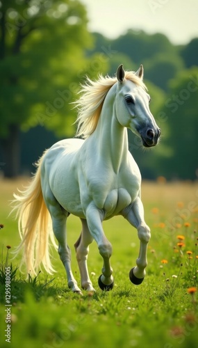 Obraz premium Majestic white stallion prancing in lush meadow, mane and tail flowing freely...