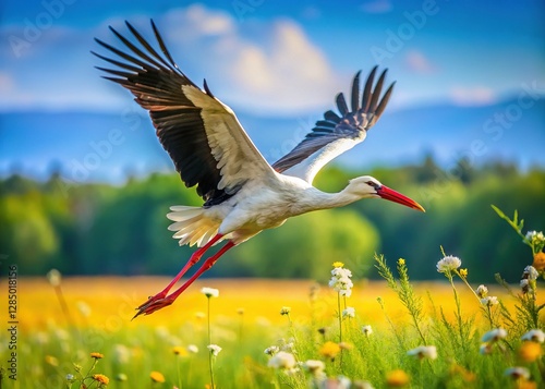© Oliver, Naklejka premium Majestic White Stork Soaring Over Lush Green Meadow - Wildlife Photography
