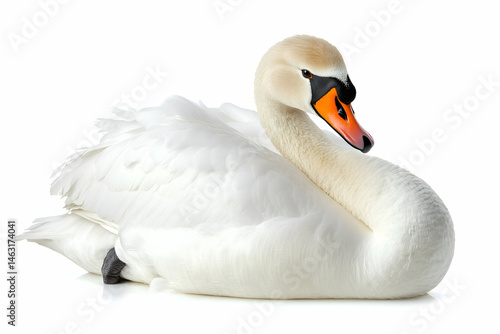 © Swaha, Obraz premium Majestic white swan elegantly posed against a pristine white background; perfect for elegant designs or nature-themed projects.