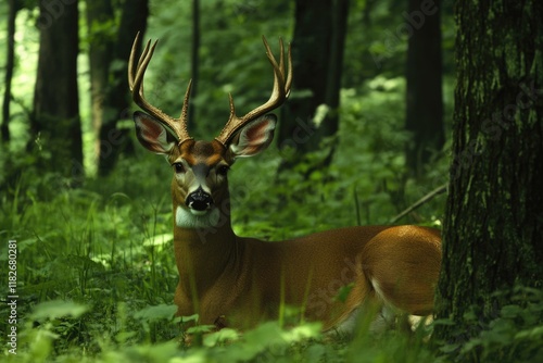 © Serhii, Naklejka premium Majestic White-Tailed Buck in a Serene Forest Setting of Tennessee