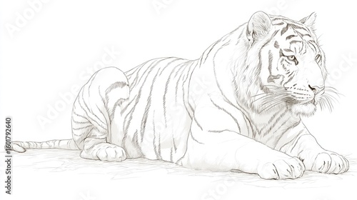 © sarun, Naklejka premium Majestic White Tiger Lying Down in a Graceful Pose with Intricate Details, Capturing the Beauty and Elegance of This Endangered Species