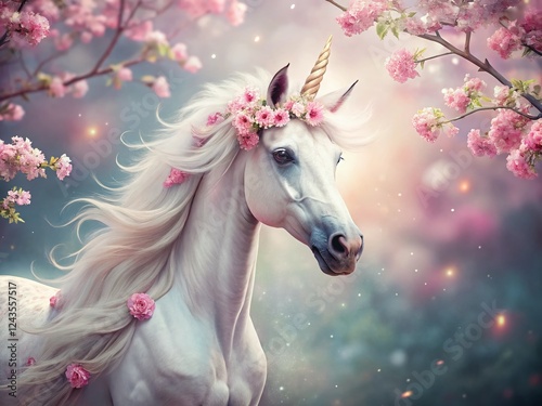 © Man888, Fototapeta premium Majestic White Unicorn with Pink Floral Crown - Elegant Fantasy Stock Photo