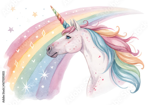 © Mosaraf Hossain, Fototapeta premium Majestic white unicorn with rainbow mane and stars on black background