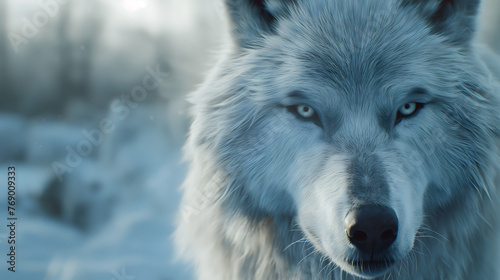 Naklejka premium Majestic White Wolf in Snowy Wilderness - A Portrait of Wild Beauty