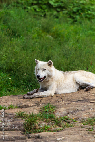 © brock, Obraz premium Majestic White Wolf Resting on Rocky Terrain