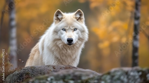© lililia, Obraz premium Majestic white wolf with piercing blue eyes standing tall in Scandinavian forest under daylight