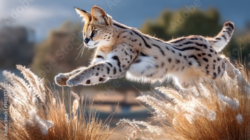 Obraz premium Majestic Wild Cat Leaping Through Tall Grass in a Natural Habitat Setting