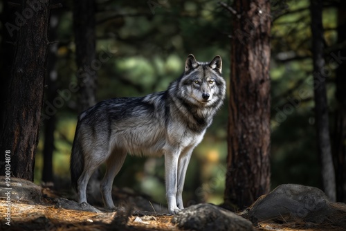 Obraz premium Majestic Wild Wolf in Coniferous Forest