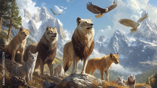© jambulart, Naklejka premium Majestic wildlife, mountain backdrop, birds in flight.