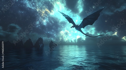 © Teerapong, Obraz premium Majestic Winged Creature Soaring over Ethereal Seascape at Starry Night