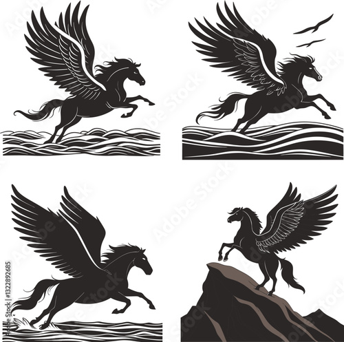 © Ahsan, Obraz premium Majestic Winged Horses and Mythical Pegasus Silhouettes.