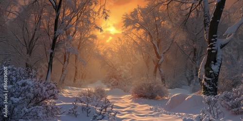 © Andrii , Naklejka premium Majestic Winter Sunrise in Forest