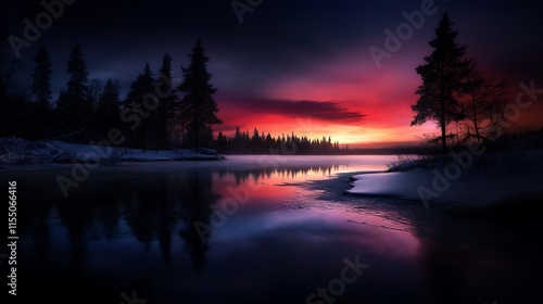 © nuryadin, Fototapeta premium Majestic Winter Sunset Over a Frozen Lake in a Pine Forest