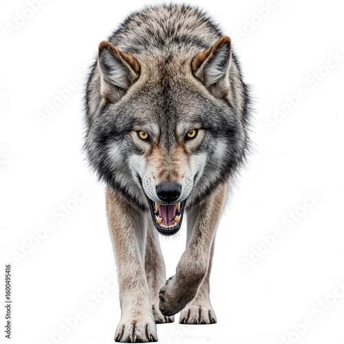 Fototapeta premium Majestic Wolf: A powerful wolf, radiating intensity and authority, strides forward with unwavering confidence. Its piercing gaze and open mouth captivate.