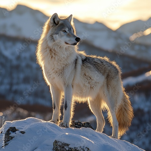 © Mega, Fototapeta premium Majestic wolf atop snowy mountain peak