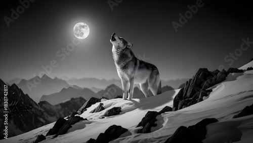 Naklejka premium Majestic wolf howling at the full moon in a stunning monochrome mountain landscape, perfect for nature, wildlife, or adventure-themed projects