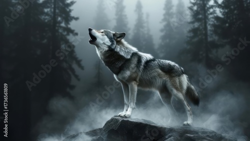 © Ami, Naklejka premium Majestic Wolf Howling in Misty Forest at Night.