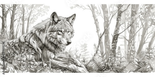 © jambulart, Naklejka premium Majestic Wolf in a Black and White Forest