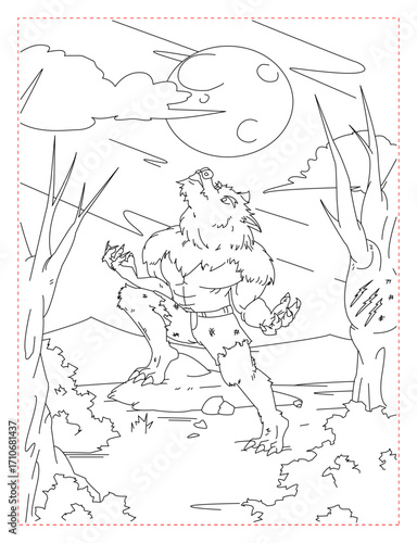 Fototapeta premium Majestic Wolf in a Forest Coloring Page: A Detailed Nature Scene
