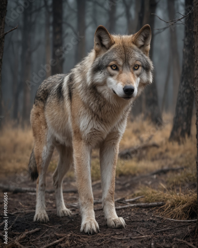 © DavidMohn, Naklejka premium Majestic Wolf in Misty Forest