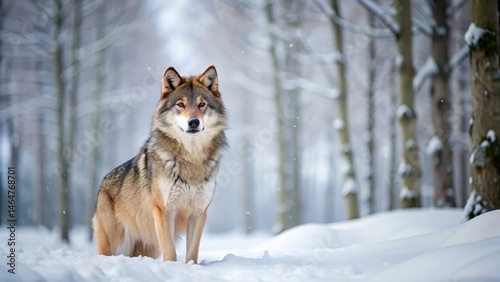 © Dounghathai, Fototapeta premium Majestic Wolf in Winter Wonderland A Solitary Canis Lupus Stands Proud Amidst a Snowy Forest