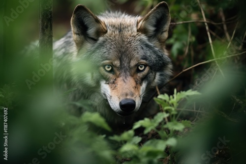 Fototapeta premium Majestic wolf peers through foliage in a lush forest setting during early morning hours