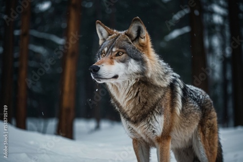 © Oleksandr, Naklejka premium Majestic Wolf Portrait in Snowy Winter Forest Environment